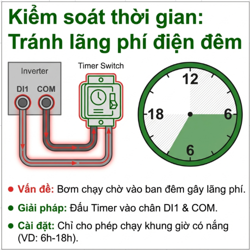 Nếu bạn không muốn bơm chạy thâu đêm (tốn tiền điện lưới vô ích), hãy lắp thêm một bộ hẹn giờ (Timer) ở đầu vào khởi động (Chân DI1 và COM). Cài đặt cho phép bơm chỉ chạy từ 6h sáng đến 18h tối. Trong khoảng thời gian này, biến tần sẽ tự lo liệu việc dùng nắng hay dùng lưới.