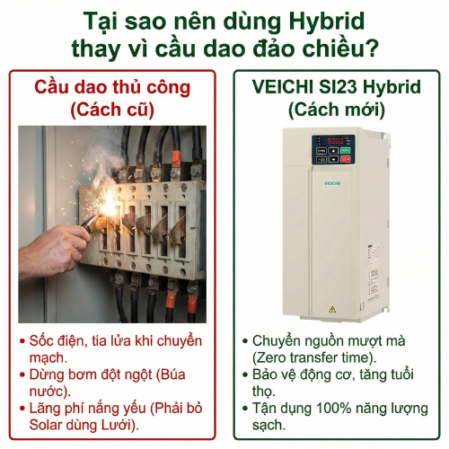 - Việc chuyển nguồn thủ công thường gây sốc điện, tia lửa điện hoặc làm bơm dừng đột ngột (búa nước). Chế độ Hybrid chuyển nguồn mượt mà (Zero transfer time), giúp tăng tuổi thọ động cơ.