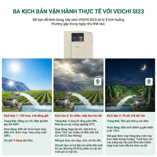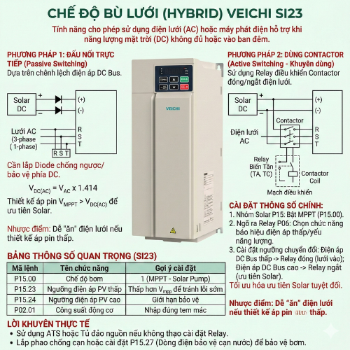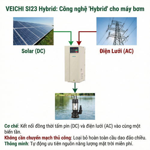 Giải pháp: Đừng vội mua thêm máy phát điện ồn ào. Câu trả lời nằm ngay trong chiếc biến tần bạn đang dùng – nếu đó là VEICHI SI23. Với chế độ Hybrid AC/DC (Lai ghép nguồn điện), thiết bị này có khả năng tự động “pha trộn” điện lưới và điện mặt trời, đảm bảo nước chảy 24/7 mà không cần bạn phải động tay vào cầu dao.
