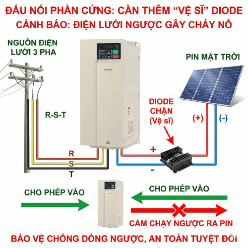 Chế độ Hybrid liên quan đến việc đấu nối hai nguồn điện áp cao (AC và DC) cùng lúc. Dù VEICHI SI23 hỗ trợ tính năng này rất tốt, nhưng để đảm bảo an toàn cháy nổ và hiệu quả, bạn nên nhờ kỹ thuật viên chuyên nghiệp tính toán số lượng tấm pin (String sizing) sao cho áp DC luôn cao hơn áp AC một chút. Đừng quên Diode chặn – chi tiết nhỏ nhưng quyết định sự sống còn của giàn pin vào ban đêm.