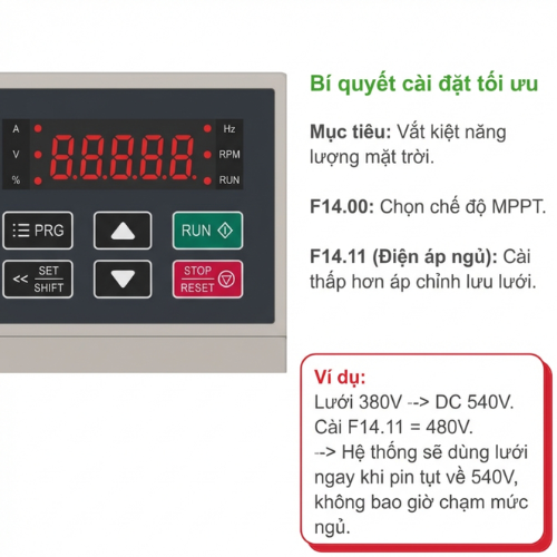 - F14.00 (Chế độ điều khiển): Chọn 2 (MPPT) để tối ưu hóa năng lượng mặt trời.