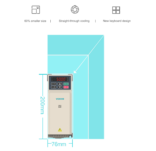 - Tản nhiệt thẳng hàng lên xuống, có thể lắp nhiều biến tần cạnh nhau, giảm thể tích tủ điện rất nhiều.