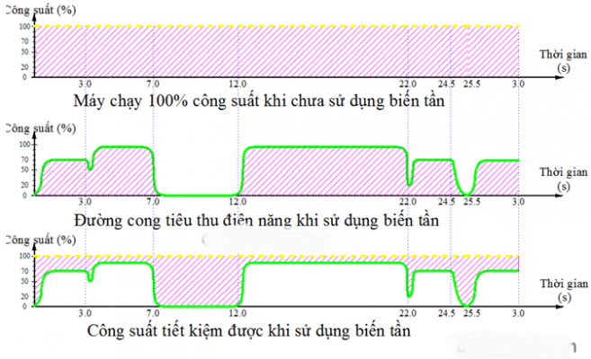 Do đó : Nếu Máy ép nhựa chạy trực tiếp không sử dụng biến tần thì động cơ luôn chạy 100% công suất cho cả 4 chu trình do vậy sẽ gây tổn thất điện năng vô cùng lớn.