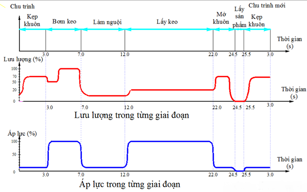 Trong quá trình hoạt động của máy, đa số thời gian tín hiệu lưu lượng sẽ lớn hơn tín hiệu áp suất, chỉ trong quá trình kẹp khuôn hay chờ làm nguội thì tín hiệu áp suất lớn hơn tín hiệu lưu lượng.