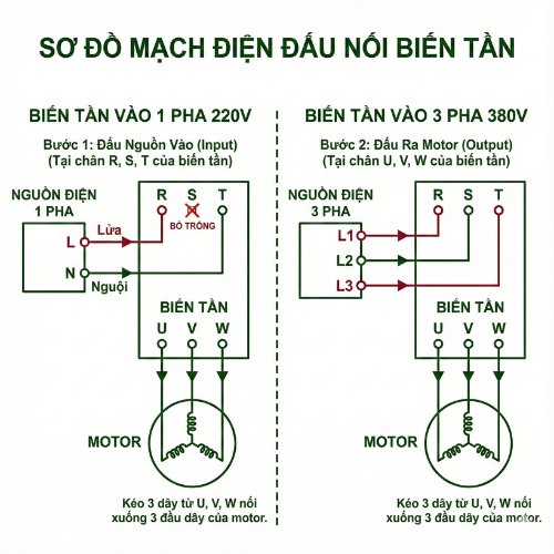 Đây là mục quan trọng nhất. Sai một bước đấu nối sẽ khiến motor bốc khói. Hãy tuân thủ tuyệt đối bảng hướng dẫn sau.