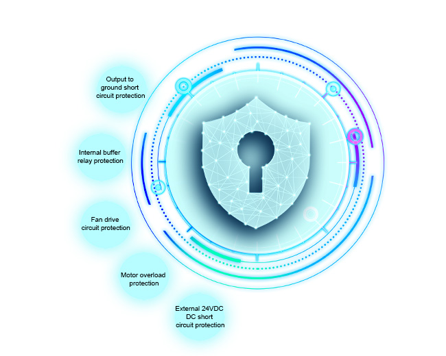Các ổ đĩa đặc biệt dòng VEICHI AC330 được trang bị khả năng bảo vệ toàn diện phần mềm và phần cứng cho các động cơ điện trở đồng bộ. Nó có các chức năng bảo vệ ngắn mạch đầu ra chạm đất, bảo vệ rơ le đệm bên trong, bảo vệ mạch ổ đĩa quạt, bảo vệ ngắn mạch 24VDC bên ngoài và bảo vệ quá tải động cơ. Nhận ra sự bảo vệ đầy đủ của động cơ và thiết bị ngoại vi.
