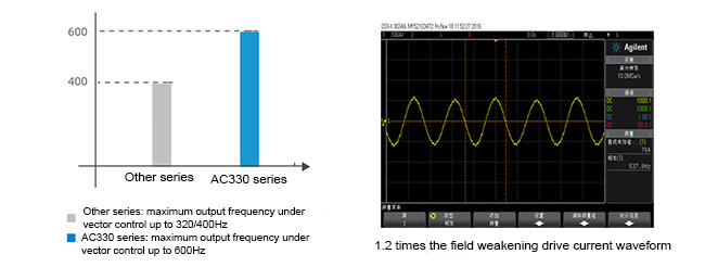 Bộ truyền động chuyên dụng AC330 được trang bị thuật toán điều khiển suy yếu trường duy nhất trên tốc độ cơ bản để tối đa hóa việc sử dụng các giới hạn điện áp. Bằng cách này, mô-men xoắn đầu ra được tối đa hóa, dải công suất không đổi được mở rộng và đảm bảo tính ổn định của hoạt động trong môi trường từ trường yếu.